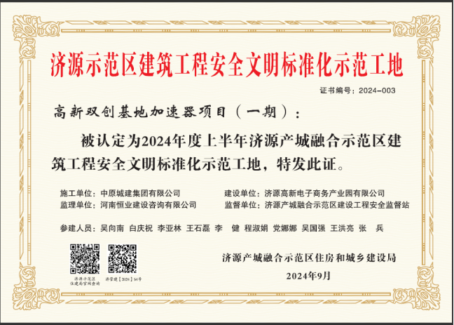 祝賀中原城建集團有限公司濟源市高新雙創(chuàng)基地加速器項目(一期)工程榮獲“濟源示范區(qū)建筑工程安全文明標準化示范工地”。